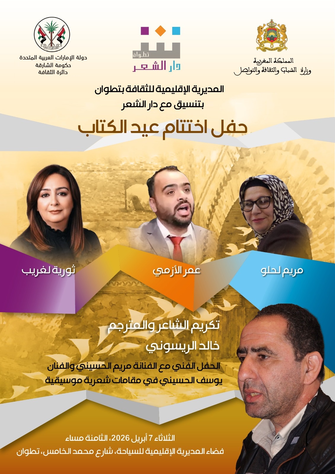 ويشارك في الأمسية الشعرية الختامية الشاعرة مريم لحلو والشاعر عمر الأزمي والشاعرة ثورية لغريب، في قراءات شعرية تجمع بين تجارب مختلفة في الكتابة، تعكس تنوعه المشهد الشعري المغربي منذ سنوات. بينما يحي الثنائي مريم الحسيني ويوسف الحسيني هذا الحفل الشعري بمقامات موسيقية وشعرية. كما يشهد اختتام عيد الكتاب بتطوان تكريم الشاعر والمترجم خالد الريسوني، الذي كان في مقدمة مثقفي المدينة الذين أحيوا تظاهرة عيد الكتاب أواخر تسعينيات القرن الماضي، وهي التظاهرة التي انطلقت منذ الأربعينيات، وكانت تحمل اسم “عيد الكتاب العربي الإسباني”، على عهد الحماية، قبل أن تحمل اسم عيد الكتاب العربي في دوراتها الأخيرة، منتصف الخمسينيات.