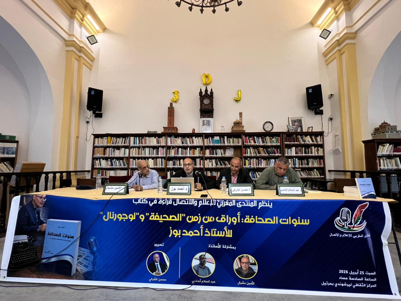 احتضن المركز الثقافي ليرشوندي بمرتيل، مساء يوم السبت 25 أبريل 2026 لقاءً ثقافياً نظمه المنتدى المغربي للإعلام والاتصال، خُصص لقراءة في كتاب “سنوات الصحافة: أوراق من زمن (الصحيفة) و(لوجورنال)” لأحمد بوز، بمشاركة الأمين مشبال، عبد السلام أندلسي، وبإدارة وتسيير محسن الشركي، وبحضور ثلة من المهتمين بالشأن الإعلامي والثقافي.